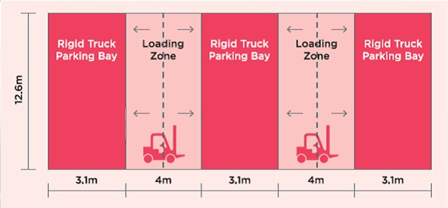 Reserved parking for fruit and vegetable buyers with a truck or Light Commercial Vehicle (LCV) includes an allocated loading zone. Loading zones are on either side of truck bays, or at the rear or side of an LCV bay. Side loading zones are shared equally by the parking bay on either side. The use of shared loading bays must comply with OHS guidelines. Refer to the diagram below: